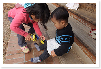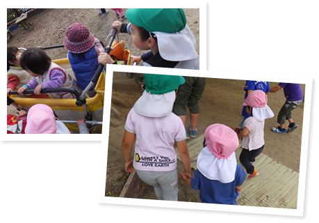 大きい子が小さい子の手をつなぎ、一緒にさんぽを楽しむ。