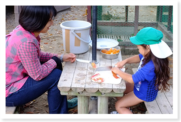 給食の野菜の切れはしなどで、5歳児が毎日交代で、うさぎの食事の世話をする。包丁の使い方を伝えたり、野菜の名前当てなどをしながら、