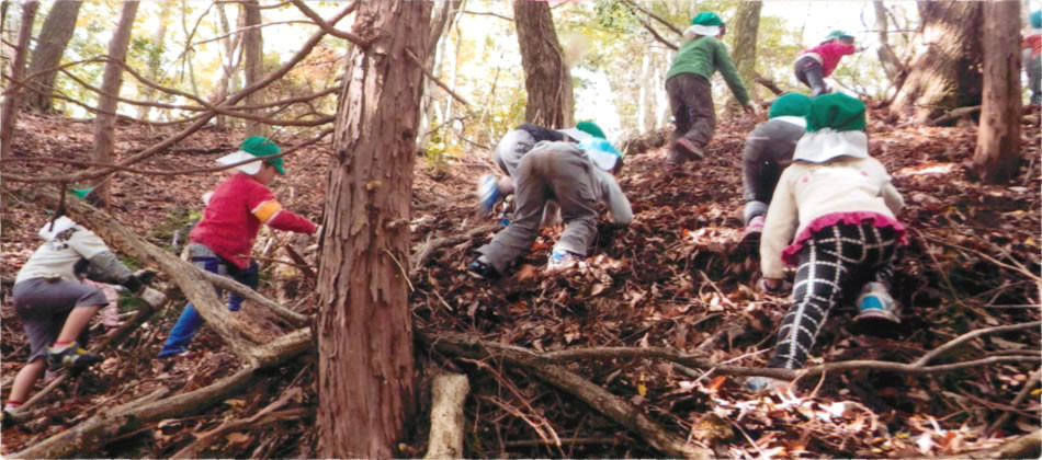 森では大人の案内がいらないほど逞しい“やまぐみ”の子どもたちは、野ウサギの如く分け入って秘密基地を目指します。「秘密基地」は形あるものを指すことばではなく、“やまぐみ”の子どもたちが樹木や枯れ枝を使ってさまざまな遊びの仕掛けを作っているフィールドを指す暗号のようなものです。