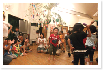 各クラスでわらべうたを楽しみ、毎月の誕生会では、クラスごとにわらべうたを披露して祝う。