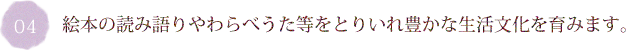 ・歌や遊びをとおして、人と人との関係をむすび広げてくれる。(社会性、コミュニケーション能力)
