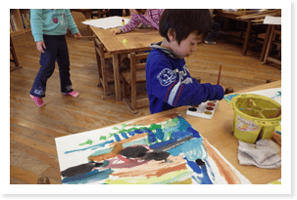 4歳児は、二人一組で風船はりこをつくります。まずちぎった新聞紙を水で濡らし風船をすっぽり包むように貼り、次に糊を水で少し薄めたものをつけた新聞紙を重ねていき、更に和紙を貼り重ねていきます。土台ができると2つに切り分け、円すい状の角を好きな数だけ貼り付け、色を塗って完成です。なかなか根気のいる作業ですが、完成を楽しみに友だちと力を合わせて頑張る姿に成長を感じます。
