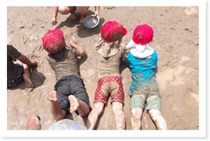 グランドや園庭に大きな水たまりを作り、泥の感触などを楽しむ。